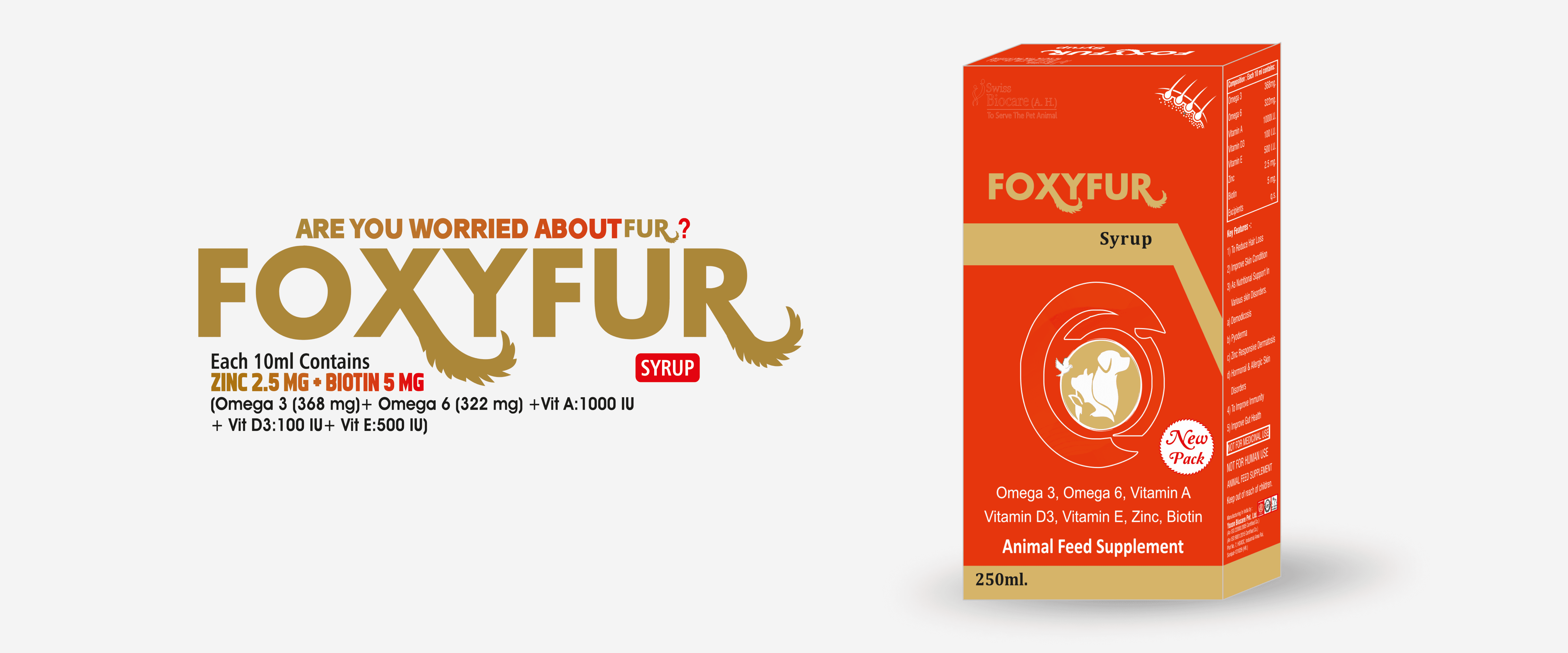 Foxyfur is a premium fur and skin health supplement for pets, enriched with Omega-3, Omega-6, Biotin, Zinc, and essential vitamins. It helps promote a shiny coat, prevent hair loss, support joint health, and improve overall skin condition.
