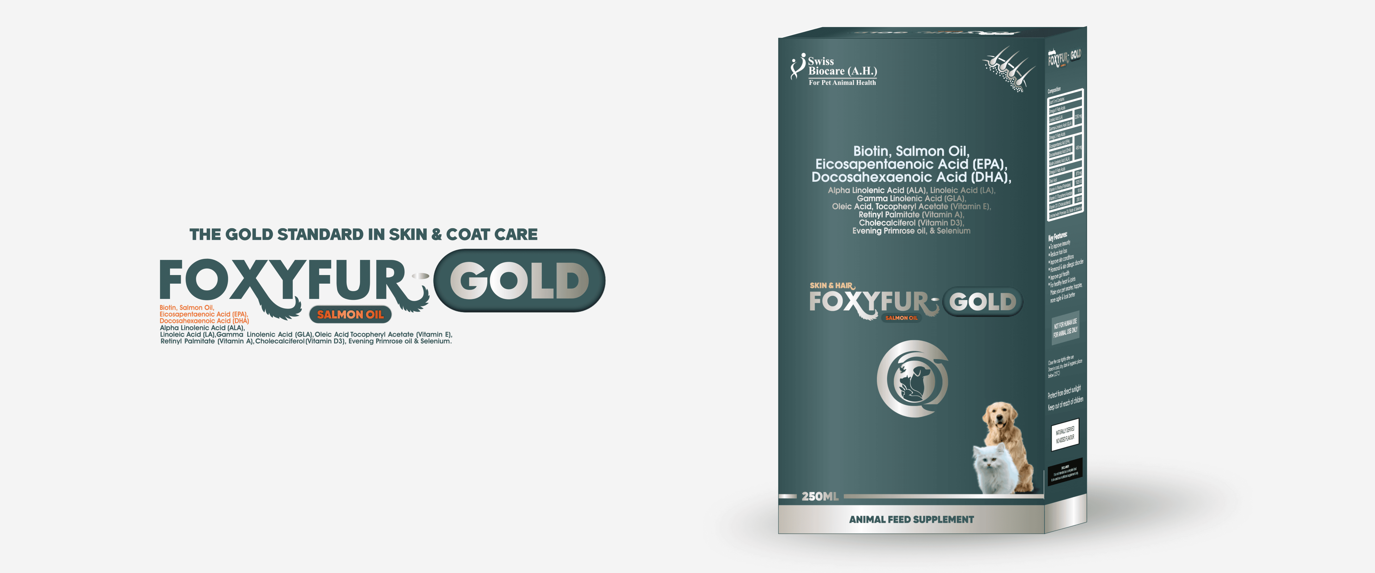 Foxyfur Gold is a premium skin and coat supplement enriched with Salmon Oil, Omega-3 & Omega-6 fatty acids, Biotin, and essential vitamins. It helps promote a healthy, shiny coat, reduces shedding, and supports overall skin hydration and nourishment.