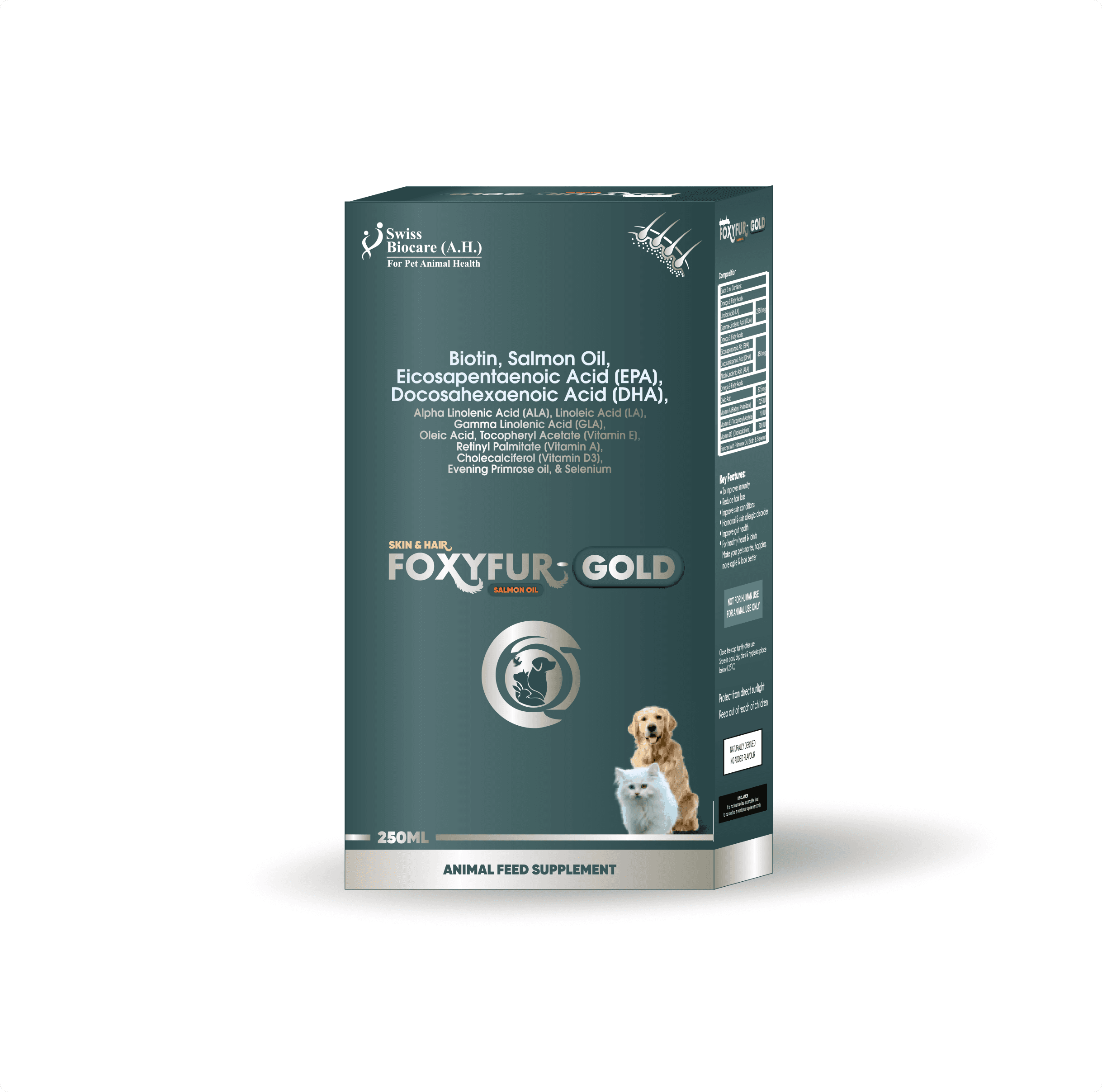 Foxyfur Gold is enriched with Salmon Oil, EPA, DHA, ALA, LA, and GLA, which provide essential omega-3 and omega-6 fatty acids. These nutrients deeply nourish the skin, reduce dryness and flakiness, and promote a lustrous, healthy coat. They also minimize shedding by strengthening hair follicles and maintaining optimal moisture balance in the skin.