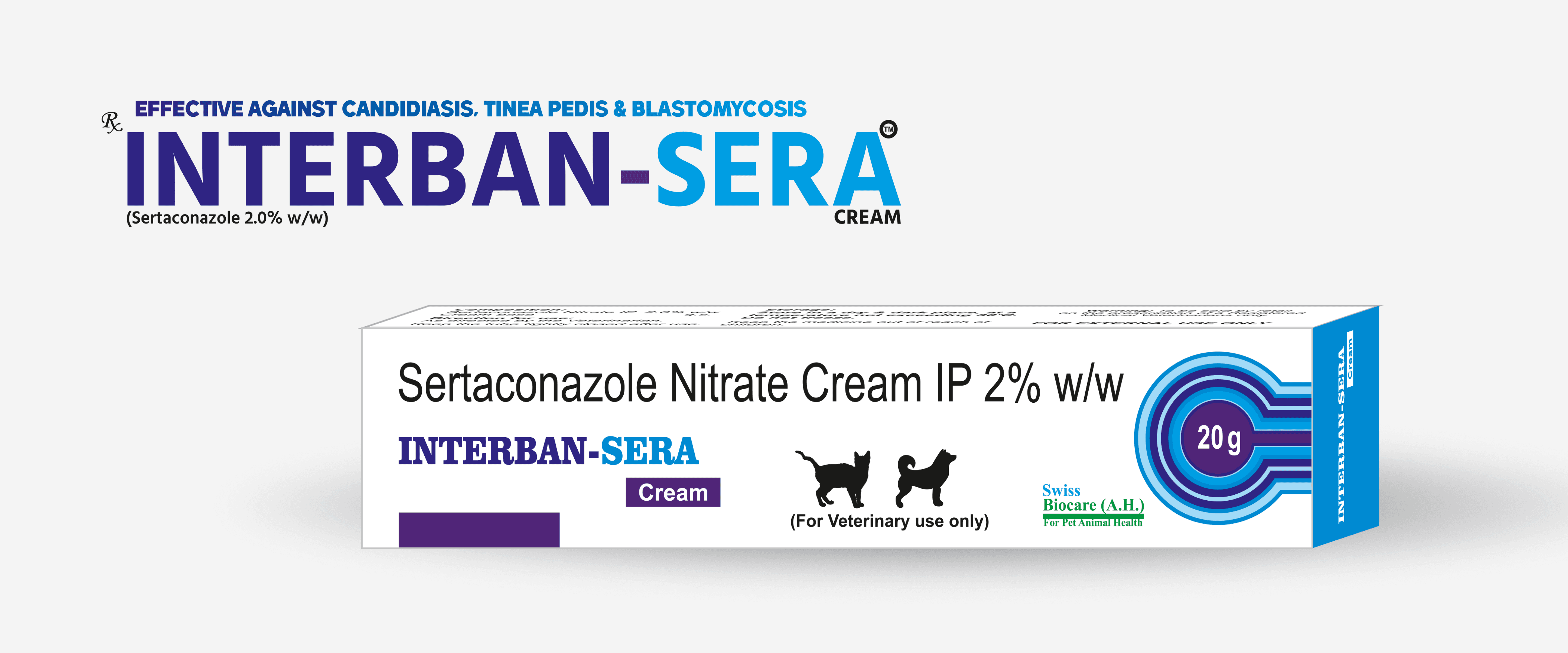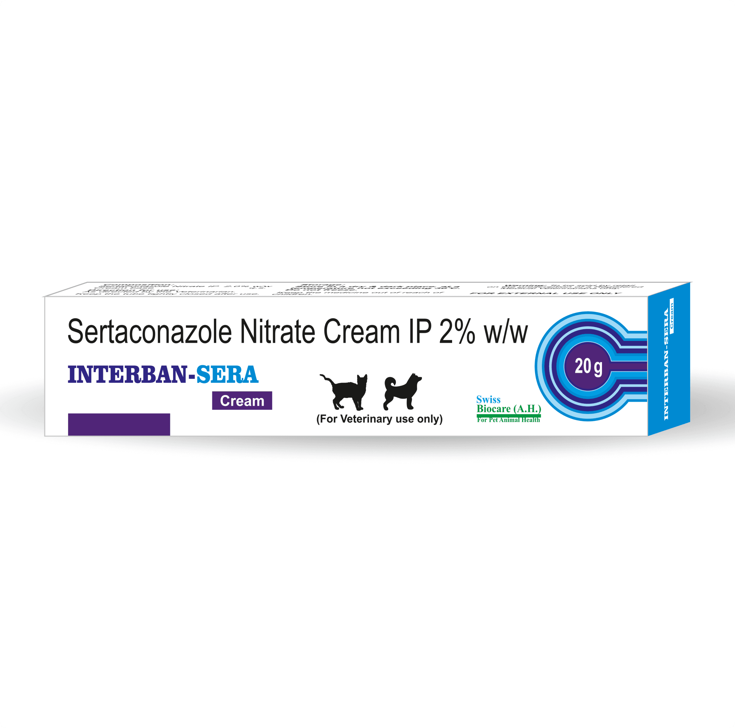 Interban-Sera is a topical antifungal cream containing Sertaconazole 2.0% w/w, which is used to treat various fungal infections of the skin and mucosa, including Dermatophytosis, Candidiasis, Blastomycosis, Malassezia, and Aspergillosis. It works by inhibiting fungal cell membrane synthesis, ensuring effective and long-lasting relief.