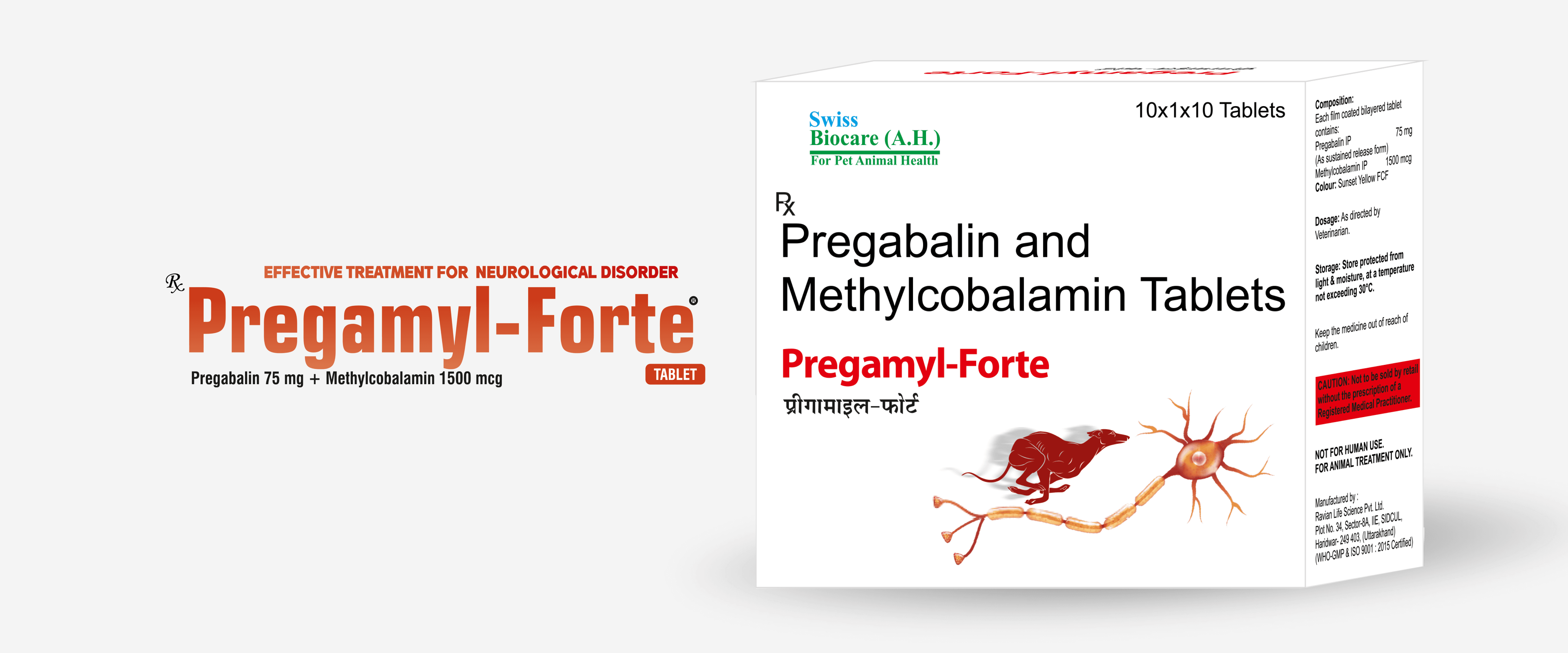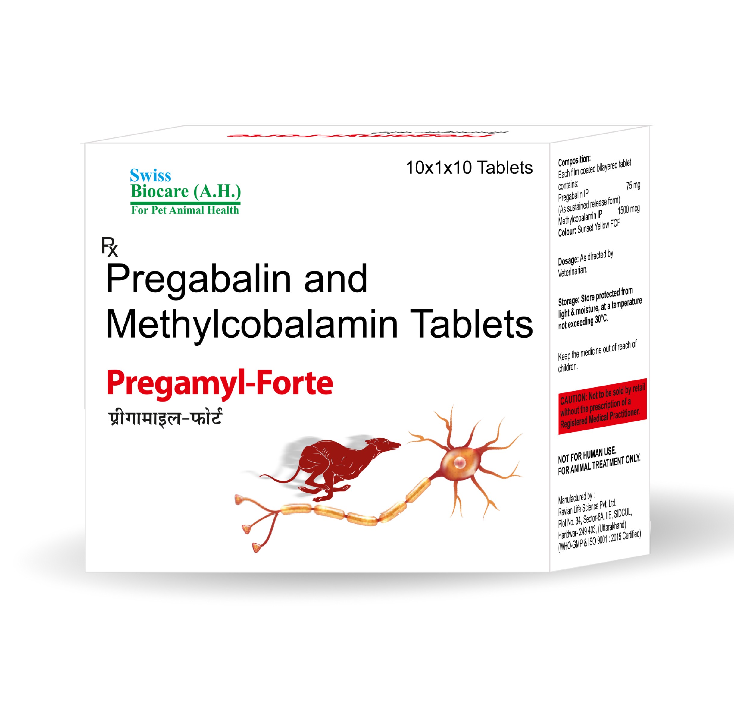 Pregamyl-Forte® is available in a single tablet formulation because it provides an optimized and precise dosage of Pregabalin (75 mg) and Methylcobalamin (1500 mcg), ensuring maximum therapeutic benefits for neuropathic pain and neurological disorders in pets. This combination is scientifically formulated to offer better efficacy than Gabapentin alone, providing higher bioavailability and faster absorption. The single variation eliminates dosing confusion, making it a reliable, convenient, and effective choice for managing epilepsy, nerve pain, muscle cramps, and hip dysplasia in pets.