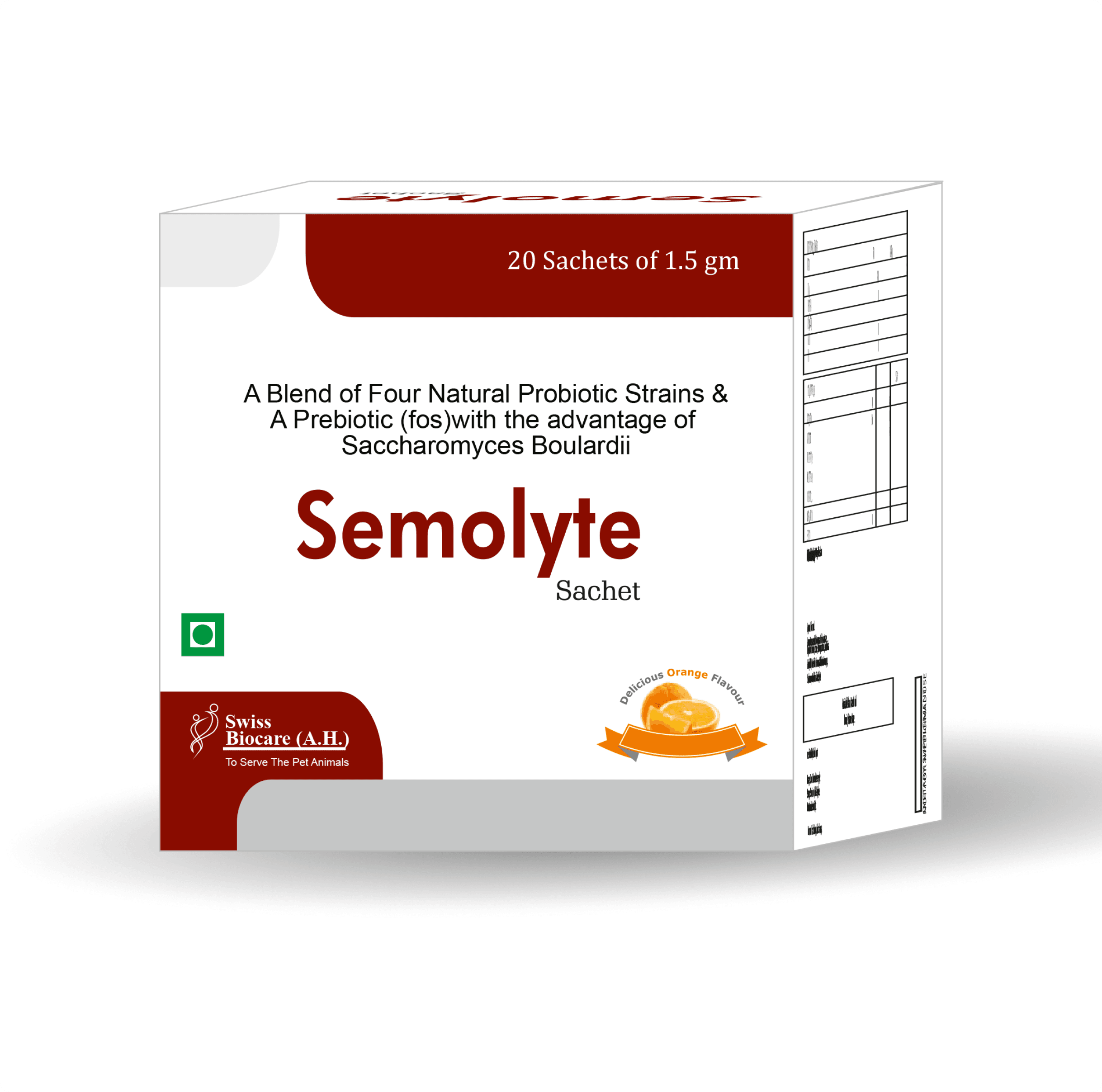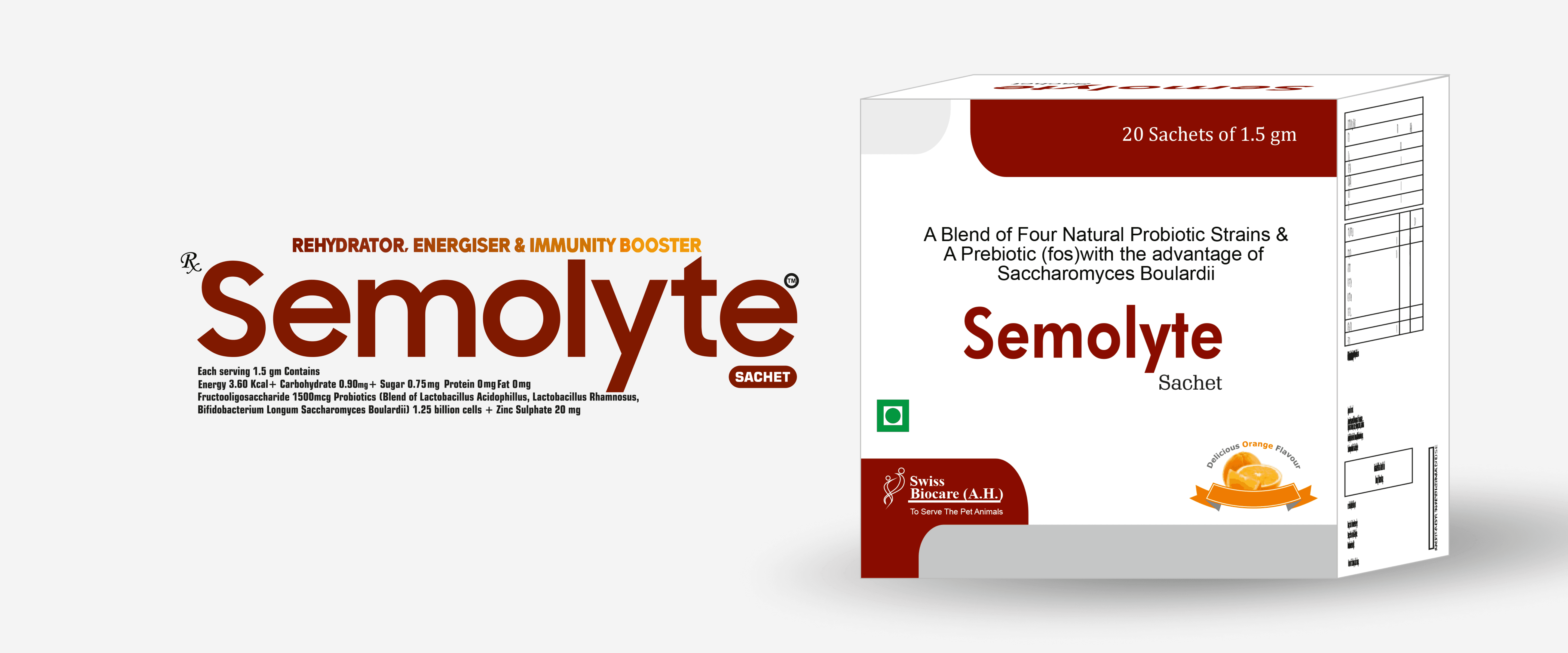 Semolyte is a rehydrator, energy booster, and gut health supplement formulated with prebiotics, probiotics, and zinc. It helps in managing diarrhea, maintaining electrolyte balance, and improving digestion and immunity in pets.