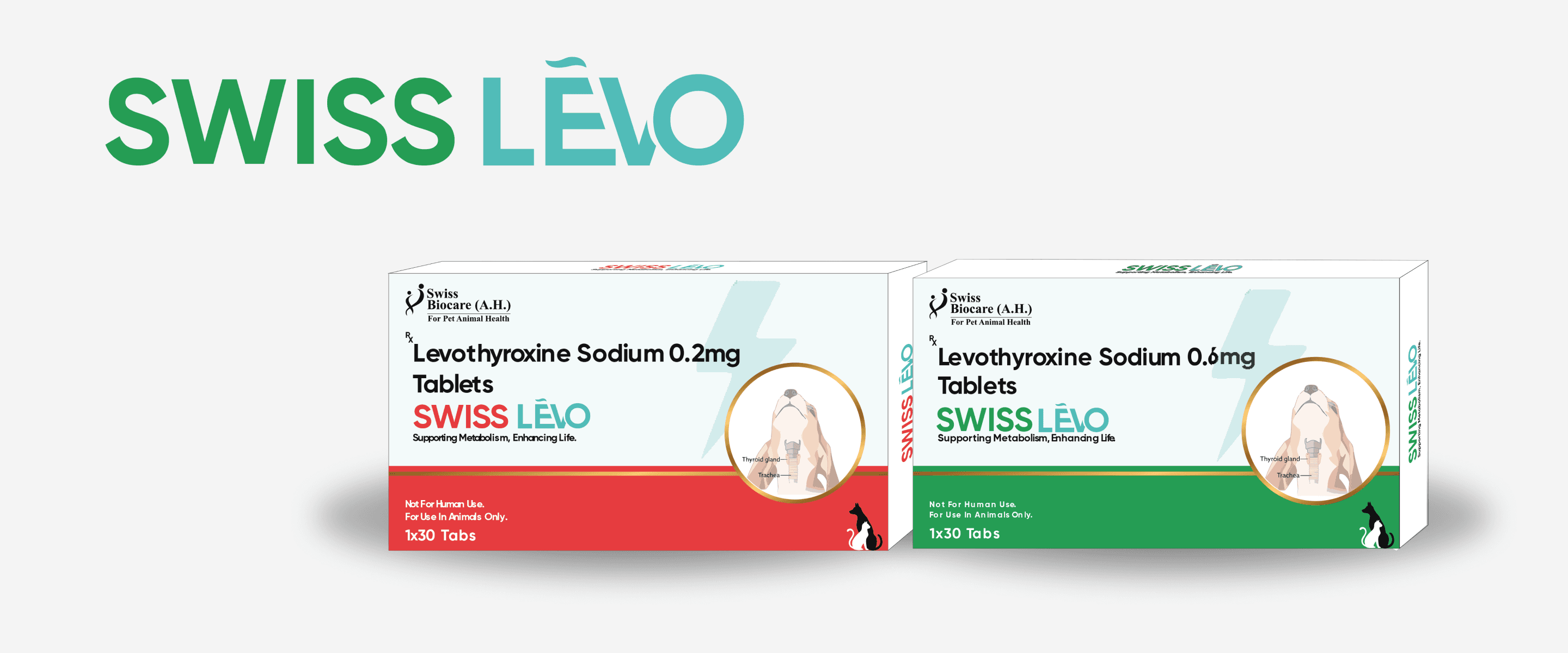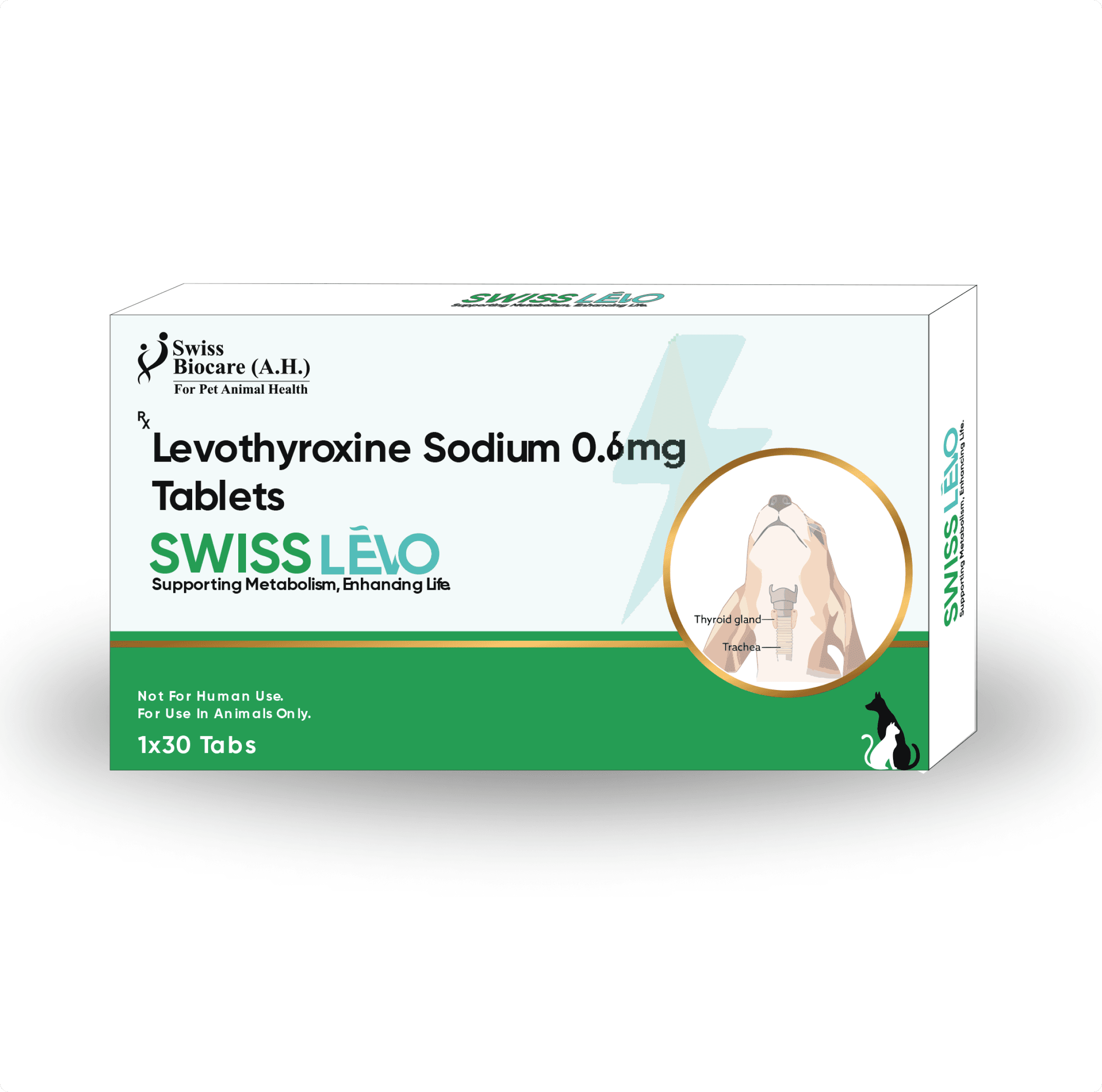 Swiss Lèvo is a thyroid hormone supplement containing Levothyroxine Sodium, used to treat hypothyroidism in dogs and cats by restoring hormone balance and metabolism.