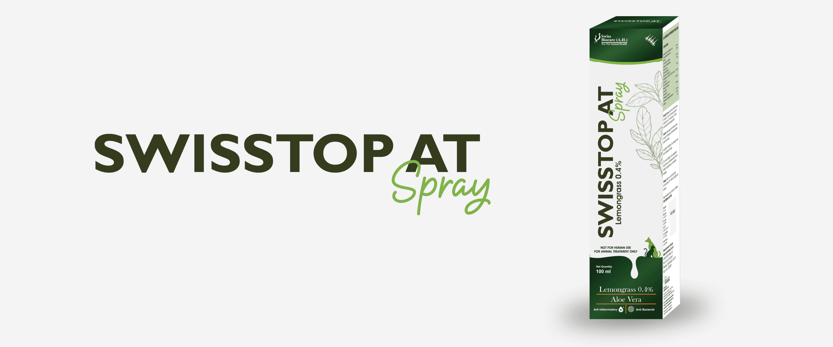 SWISSTOP AT is an Ayurvedic spray for pets that relieves itching, redness, and skin inflammation while promoting fast healing.