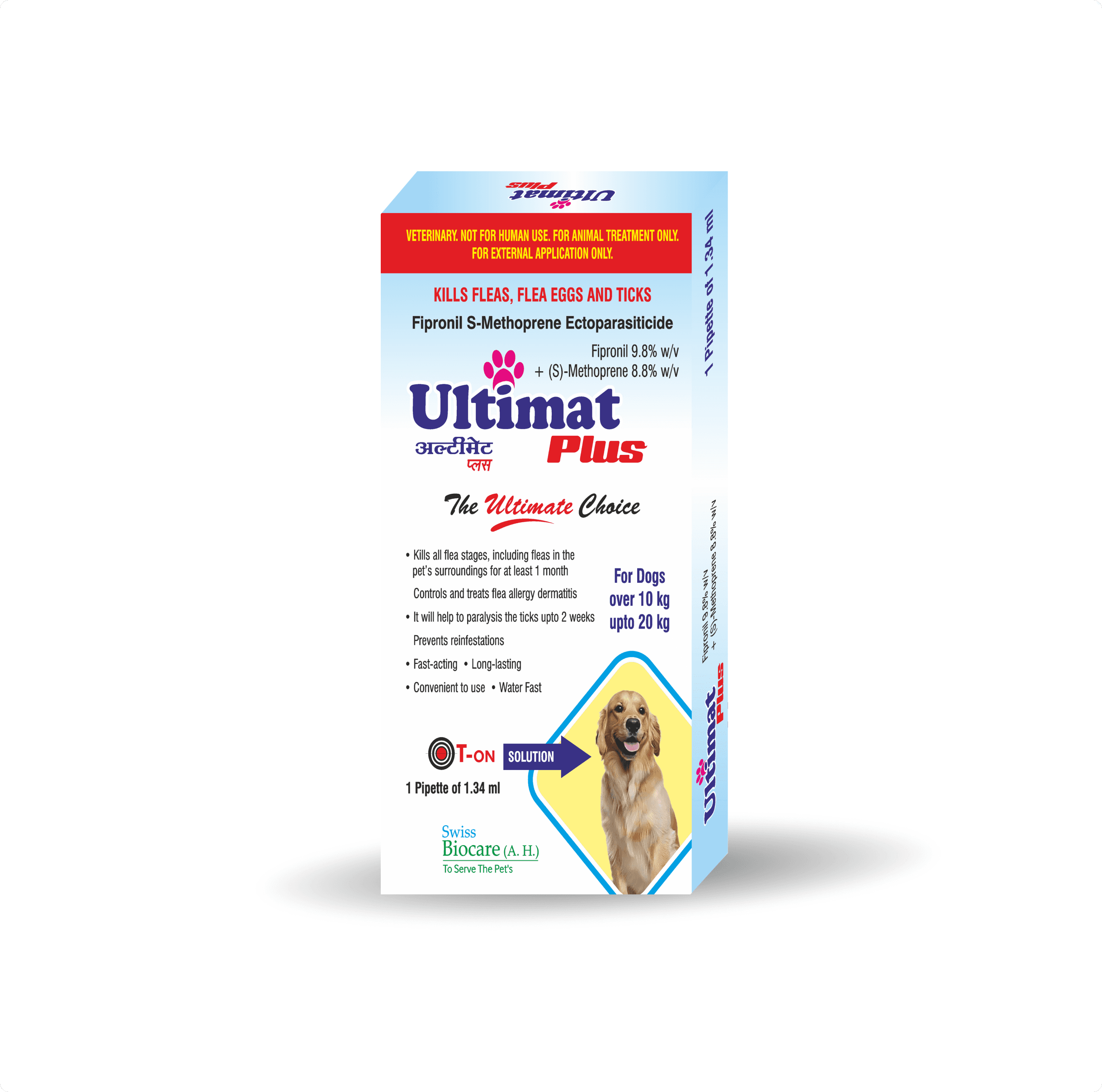 Ultimat® Plus is an advanced flea and tick treatment containing Fipronil (9.8%) and (S)-Methoprene (8.8%), providing fast-acting, long-lasting protection for dogs against infestations. It effectively kills adult fleas, ticks, and prevents flea eggs and larvae from developing, breaking the life cycle.