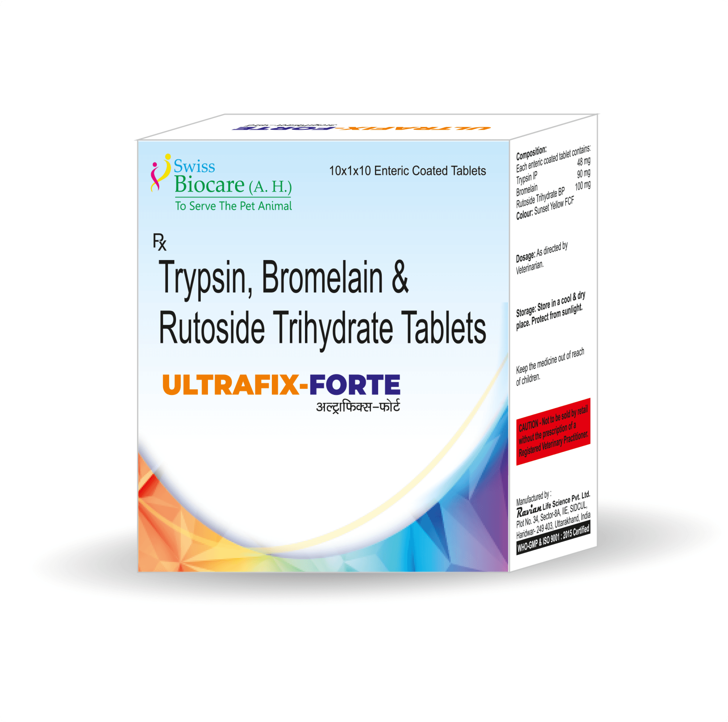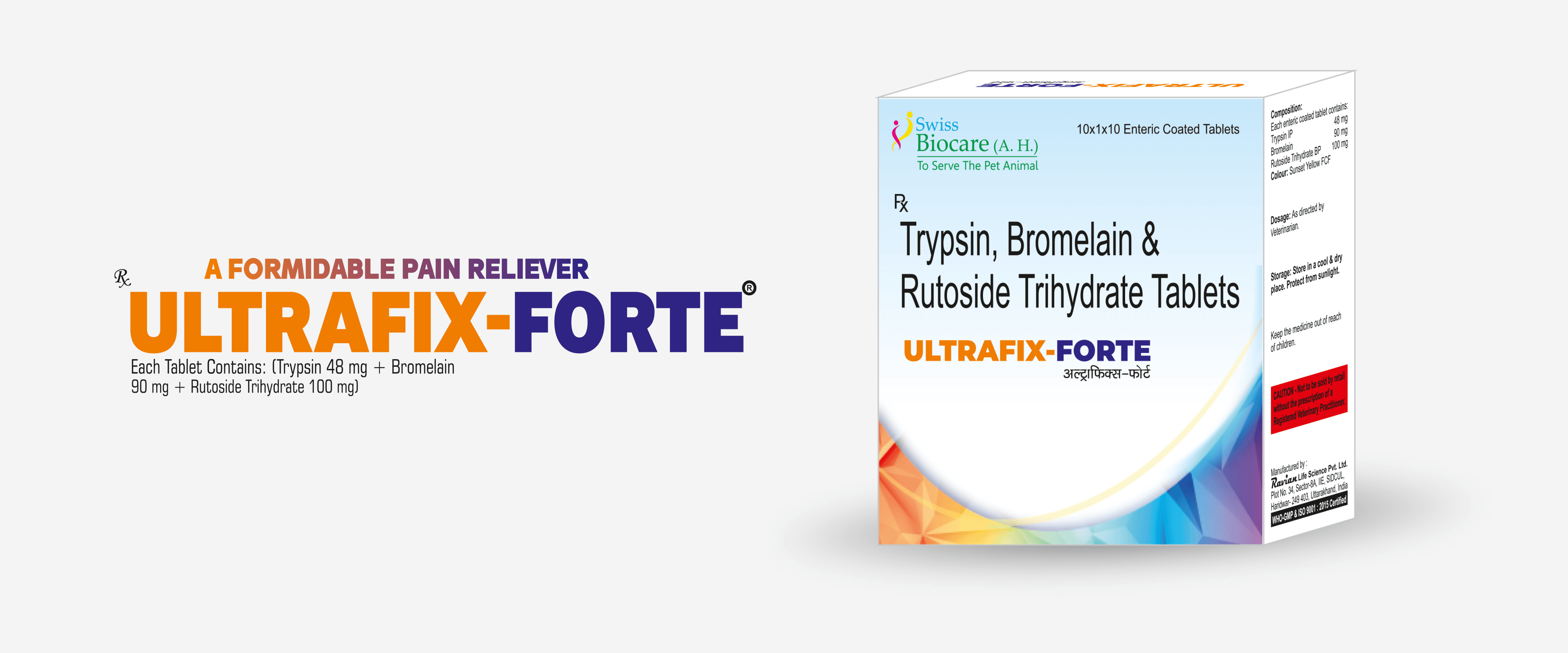 ULTRAFIX-FORTE is a powerful anti-inflammatory and pain-relieving supplement that helps in managing infections, post-surgery wounds, fractures, muscular cramps, joint pain, and inflammation. It is also beneficial in conditions like gingivitis, otitis externa, and tumorous wounds, promoting faster healing with minimal scar formation.