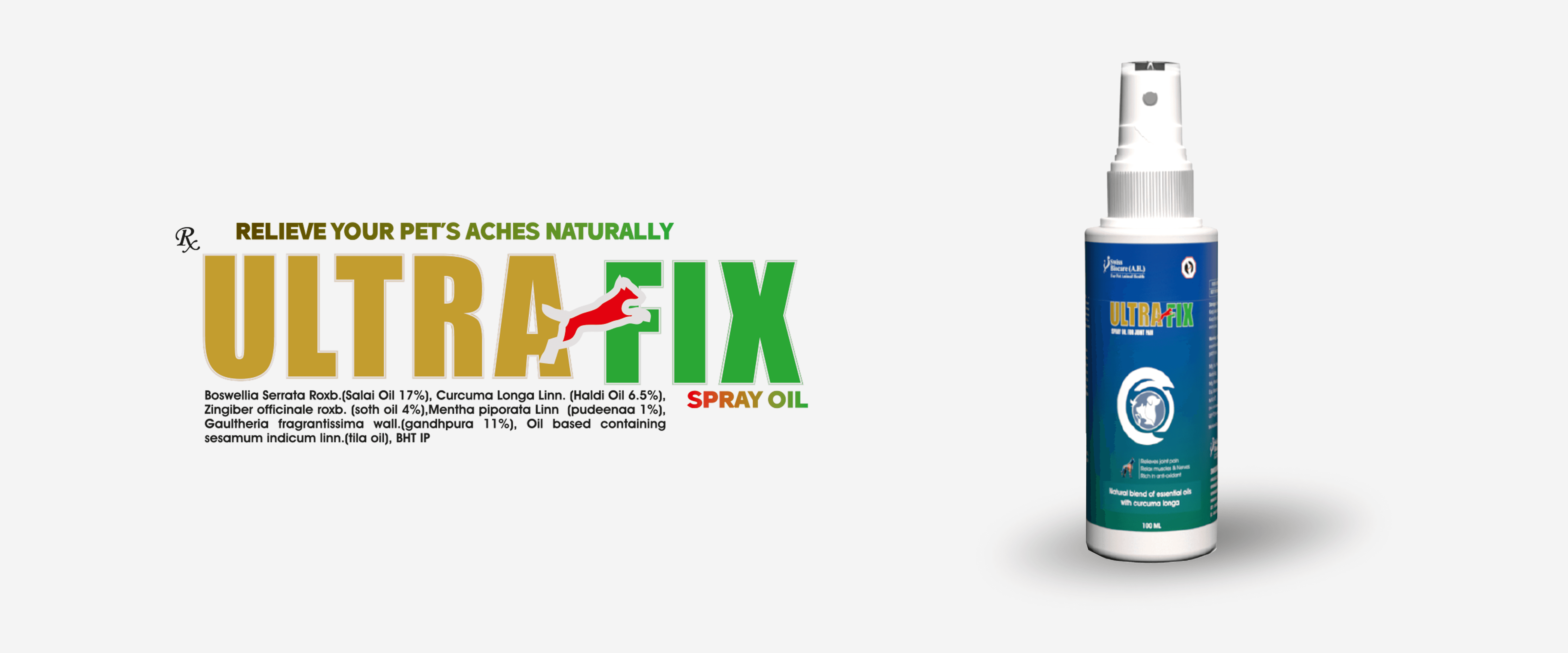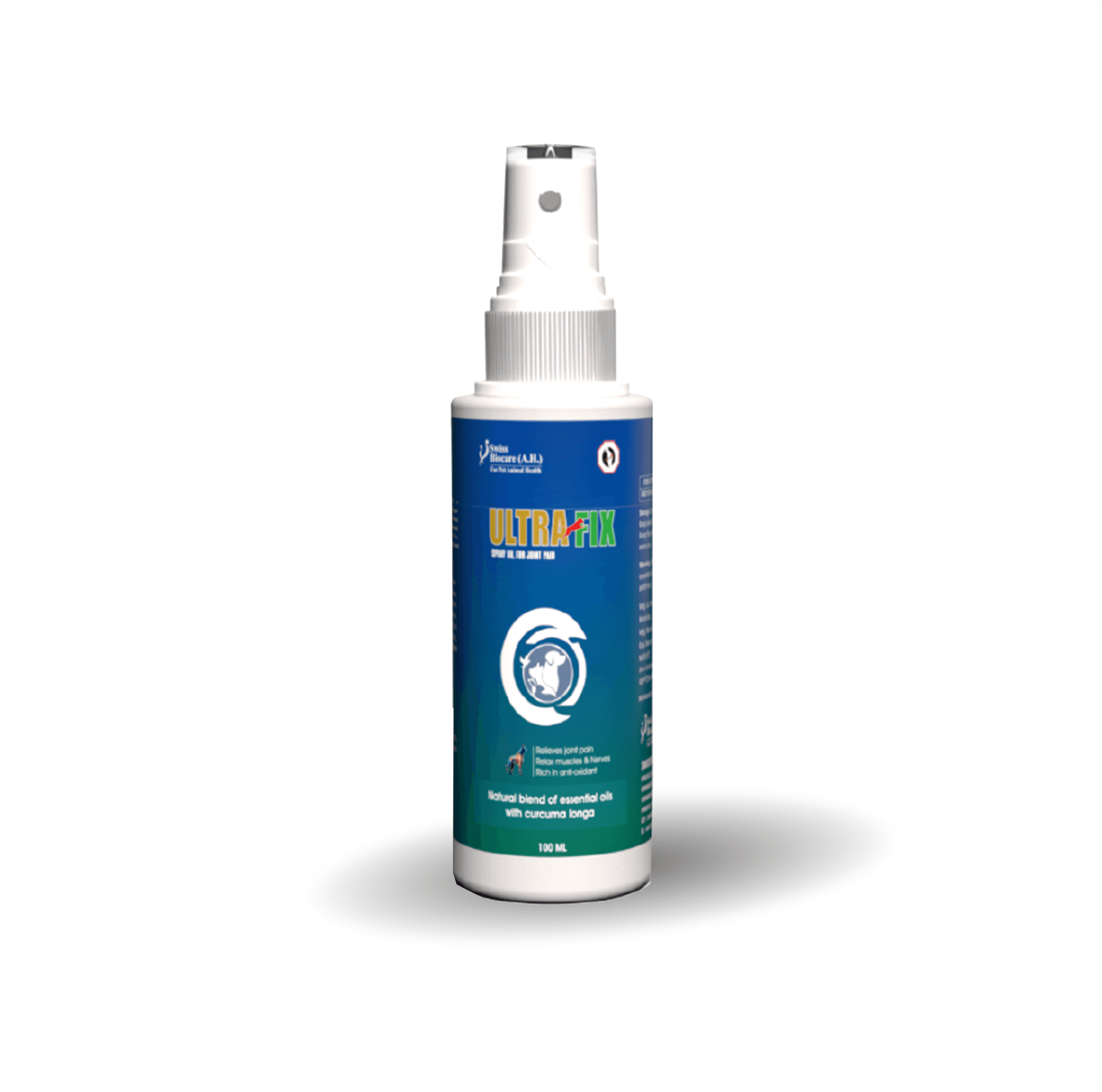 ULTRAFIX SPRAY OIL is a natural pain-relief oil formulated with Boswellia Serrata, Turmeric, Wintergreen, Ginger, Peppermint, and Sesame Oil. It helps reduce inflammation, relieve joint and muscle pain, and support mobility in pets suffering from arthritis, hip/elbow dysplasia, and muscle cramps. It is lick-safe, non-toxic, and suitable for all ages.