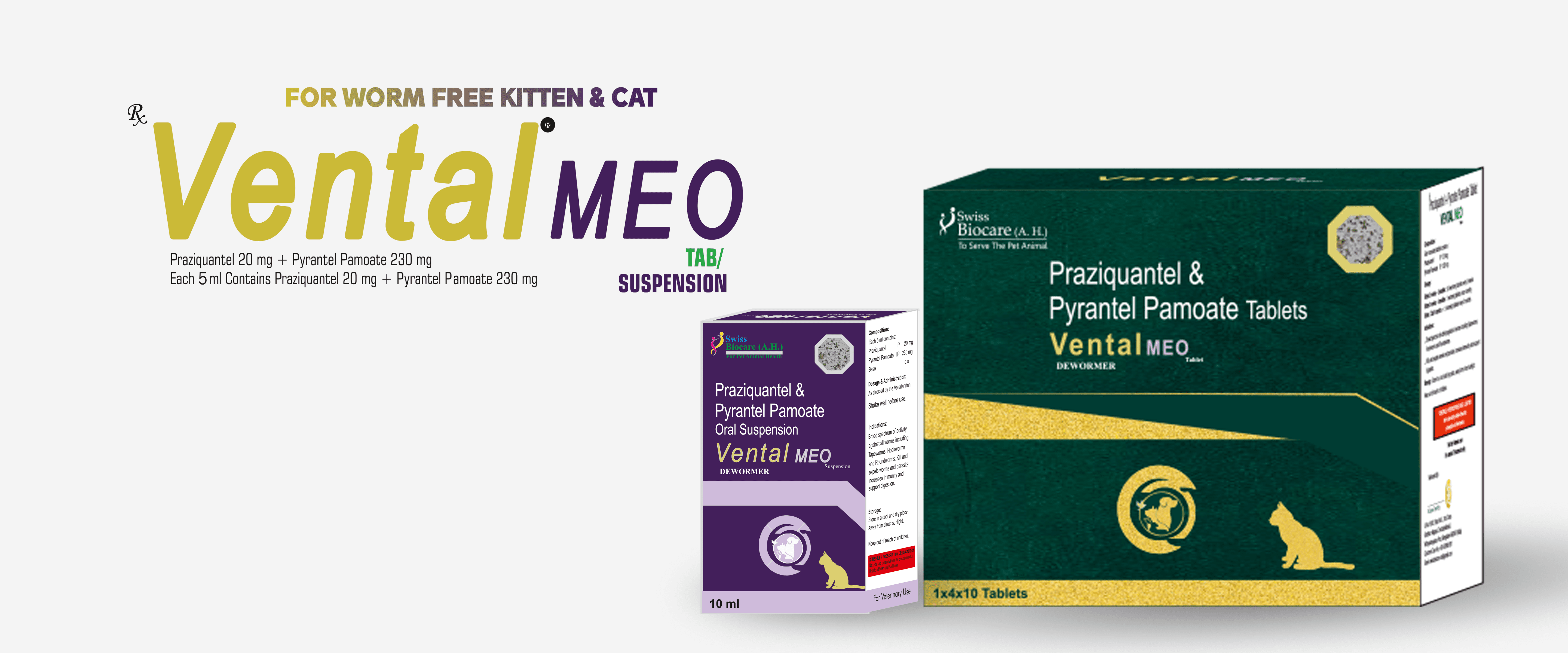 Vental MEO comes in two variations—oral suspension (10ml) and tablets (1410)—to ensure convenient and stress-free deworming for cats. The suspension allows precise weight-based dosing, making it ideal for kittens and small cats, while tablets offer a fixed dose for larger cats. This flexibility ensures easy administration based on pet preference and owner convenience. With its broad-spectrum action, single-dose efficacy, and USFDA-compliant formulation, Vental MEO is a safe, effective, and trusted choice for eliminating intestinal worms in cats.